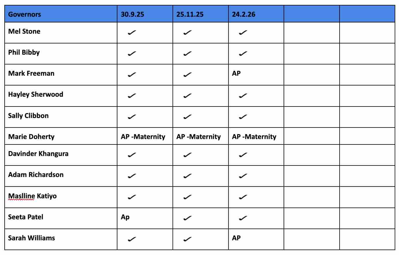 Below is a record of the attendance of governors at Full Governing Body meetings this year: