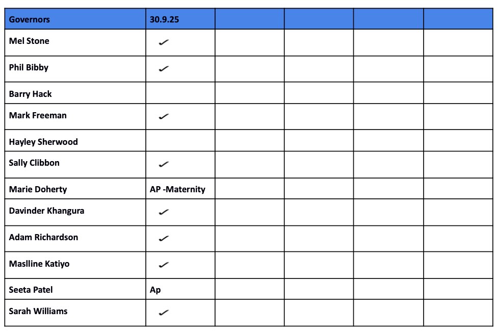 Below is a record of the attendance of governors at Full Governing Body meetings this year:
